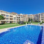 Jednoložnicový apartmán s verandou a výhledem na bazén, jen 250 m od pláže a Marina Dinevi v Saint Vlas.