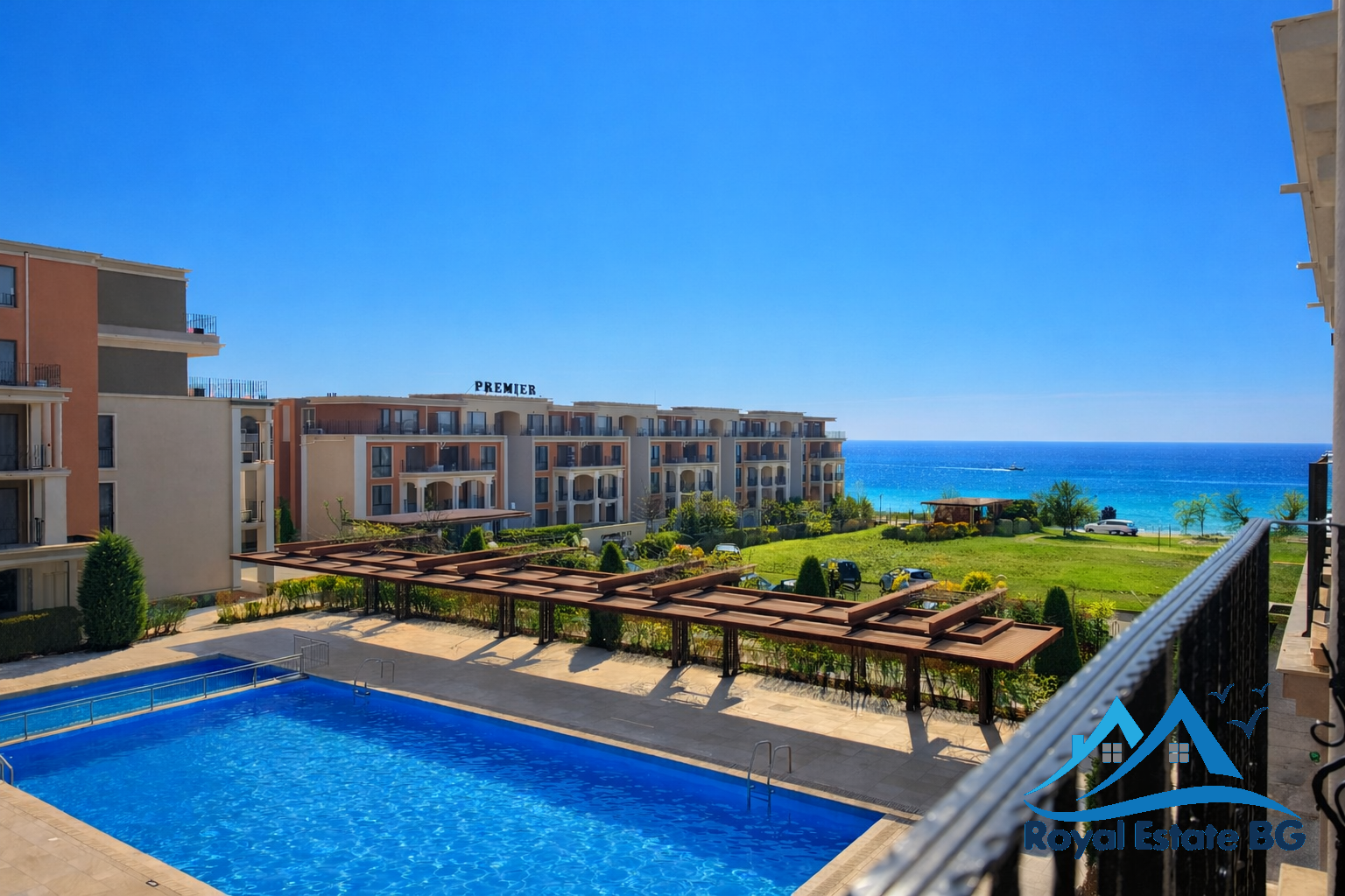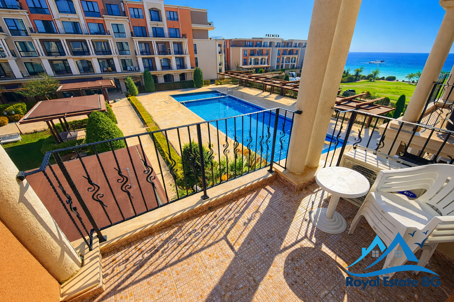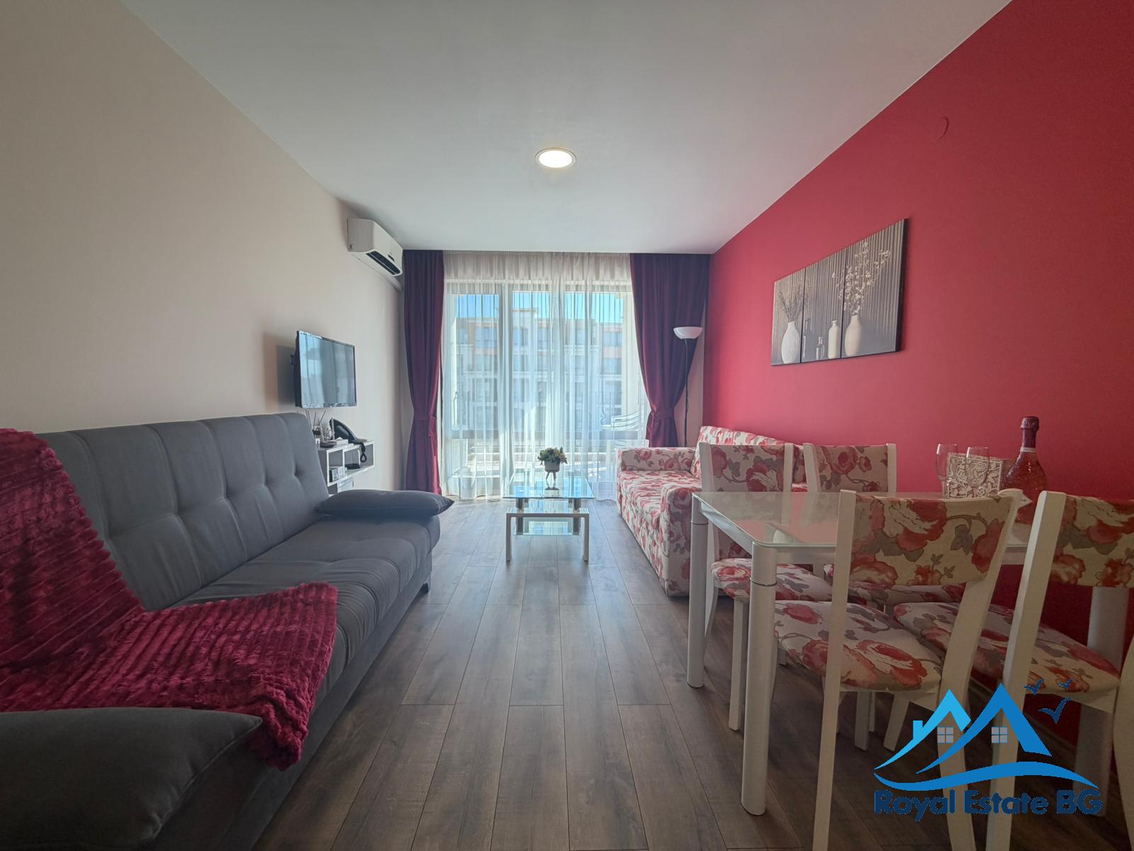 Spacious one bedroom apartment with sea and pool view for sale in the Premier Fort Beach complex in Sveti Vlas, a highly sought-after beachfront development known for its excellent maintenance, modern facilities, and prime location on the Bulgarian Black Sea coast.