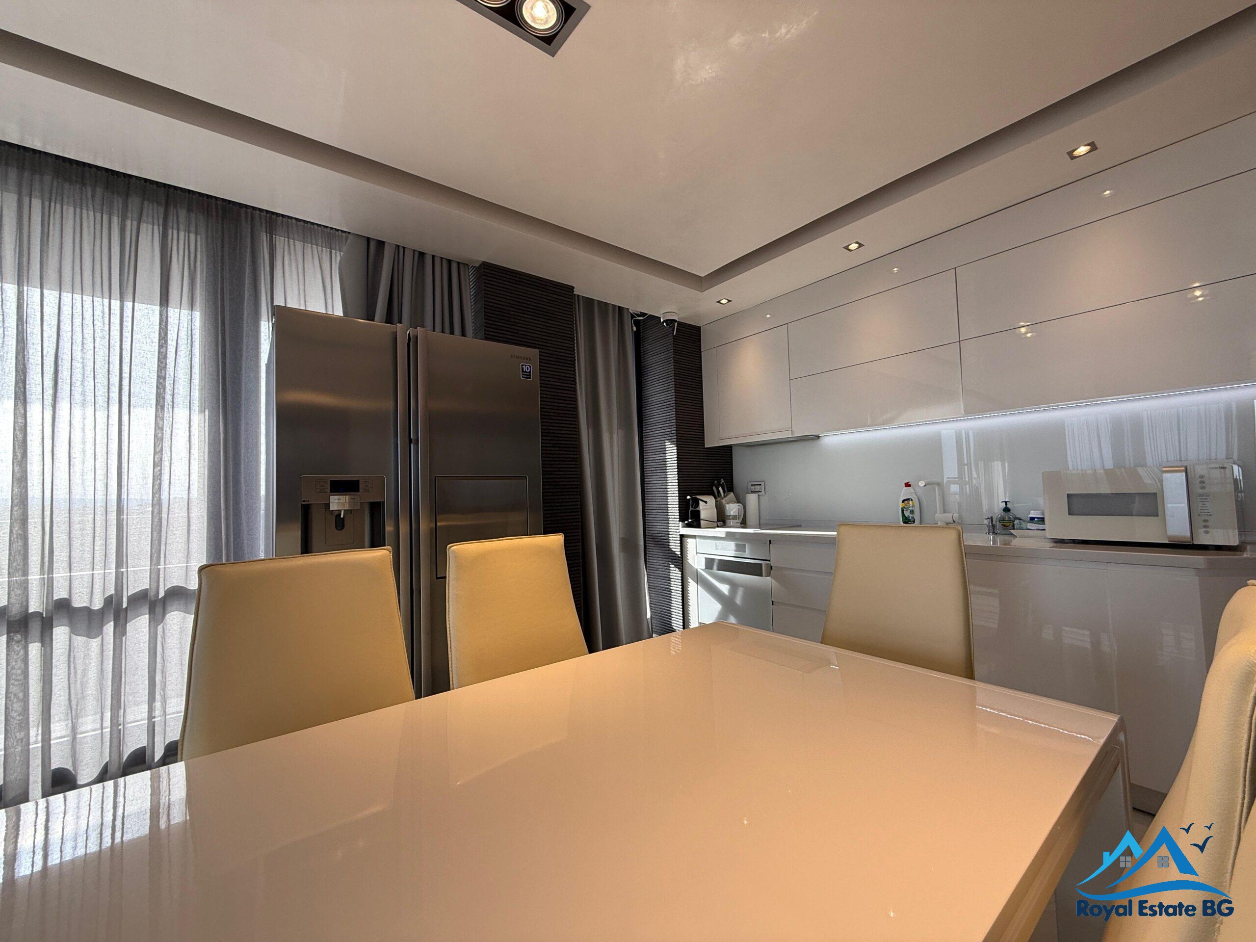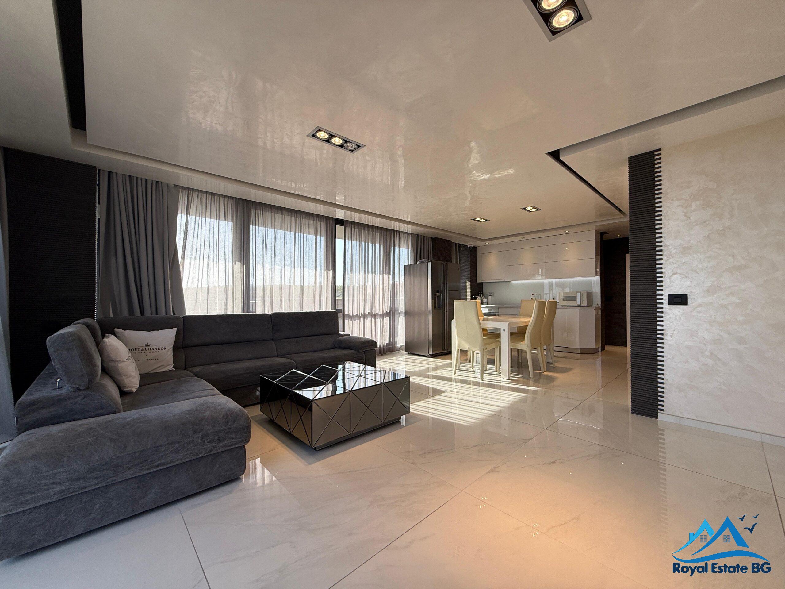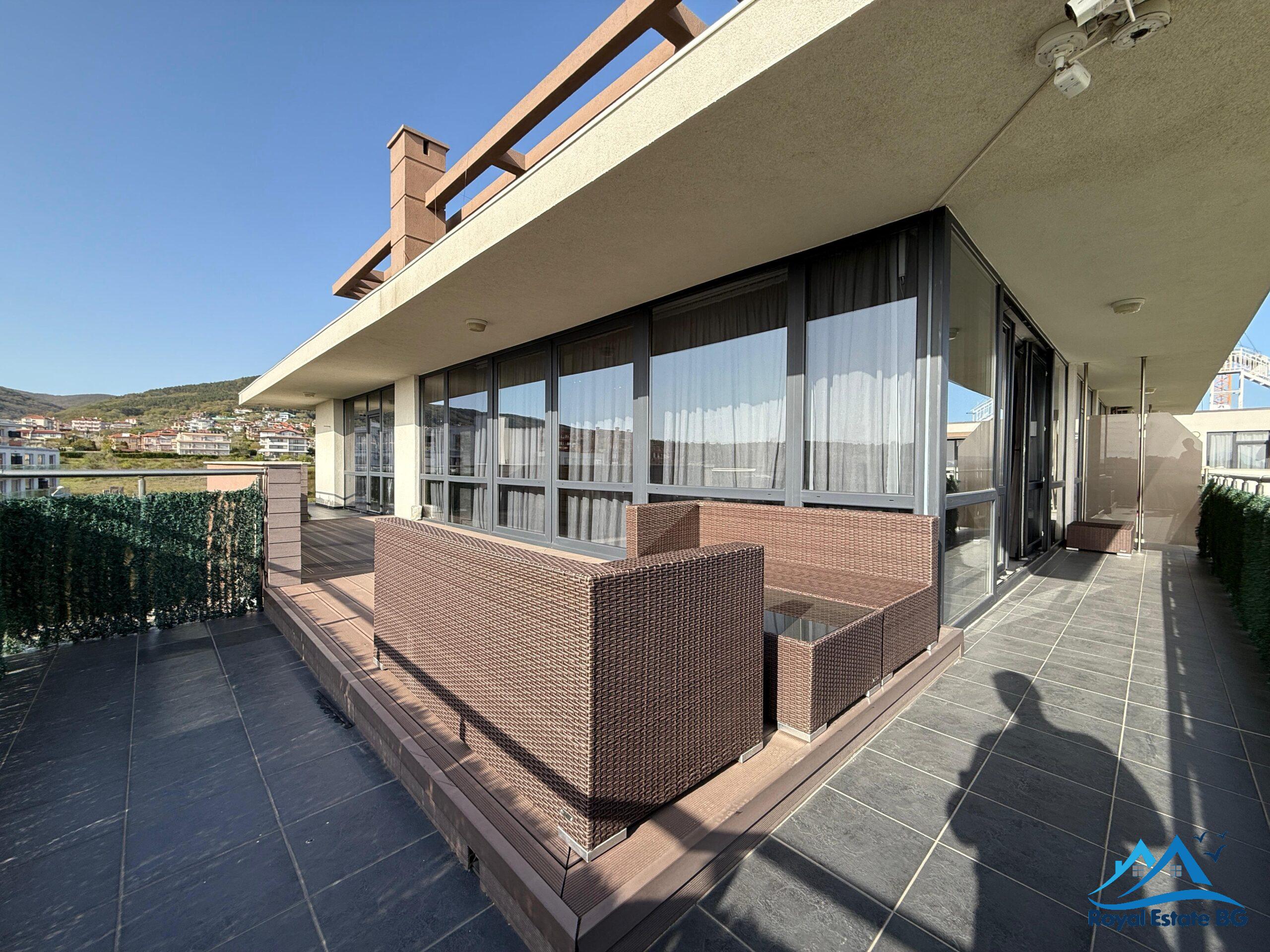 просторен хол с кухненски кът и трапезария, две спални, две бани с две тоалетни, и огромна тераса