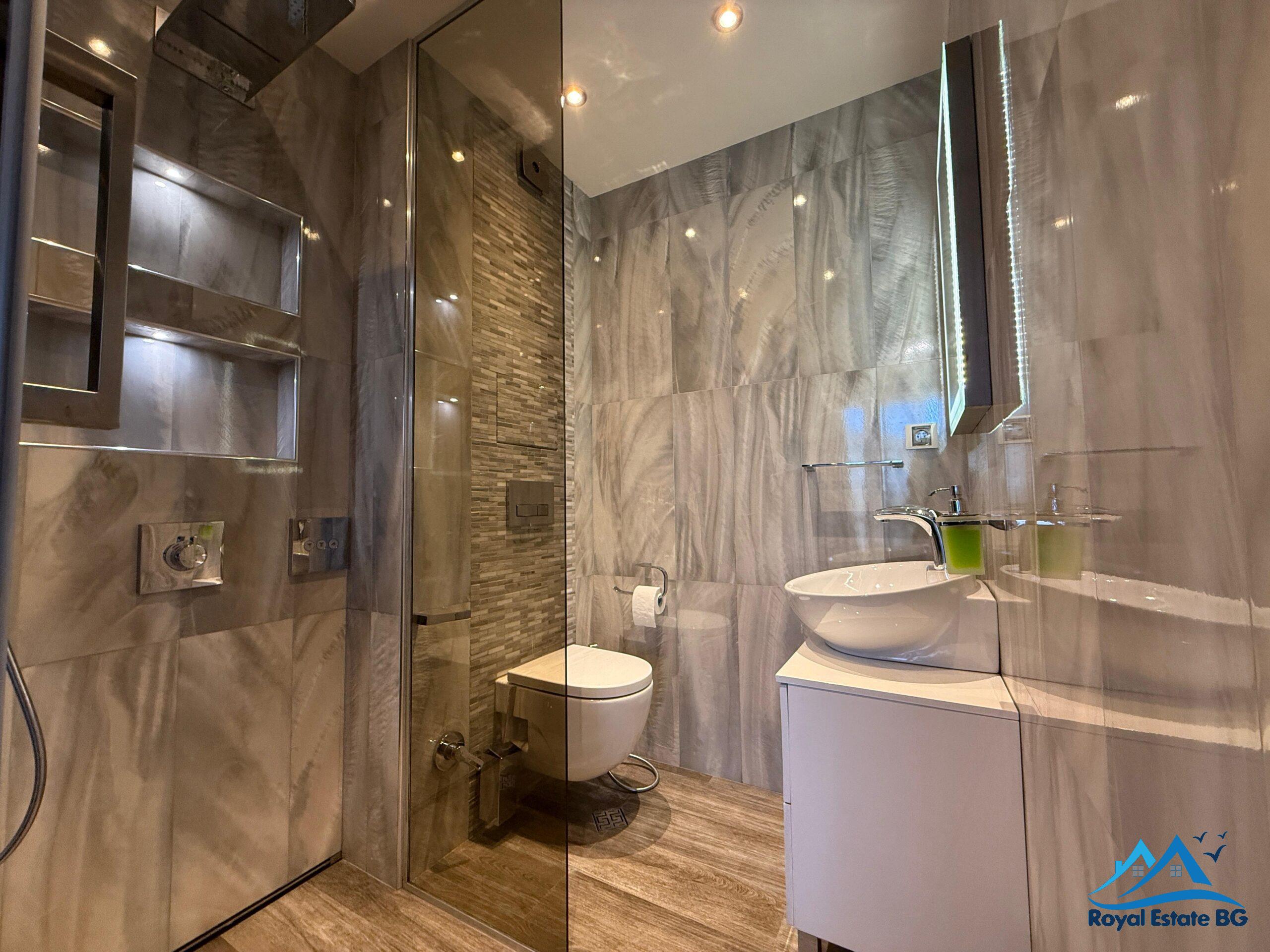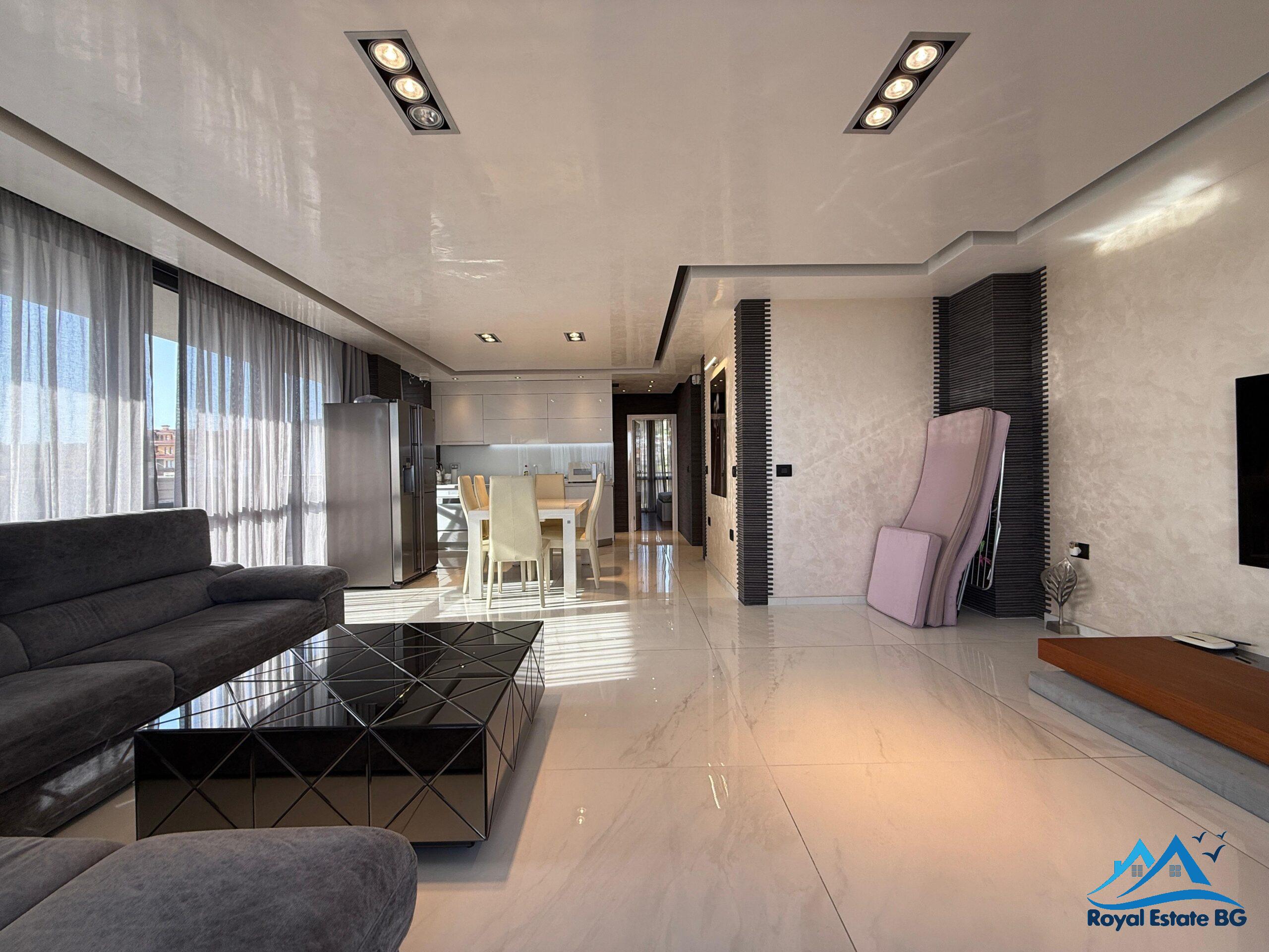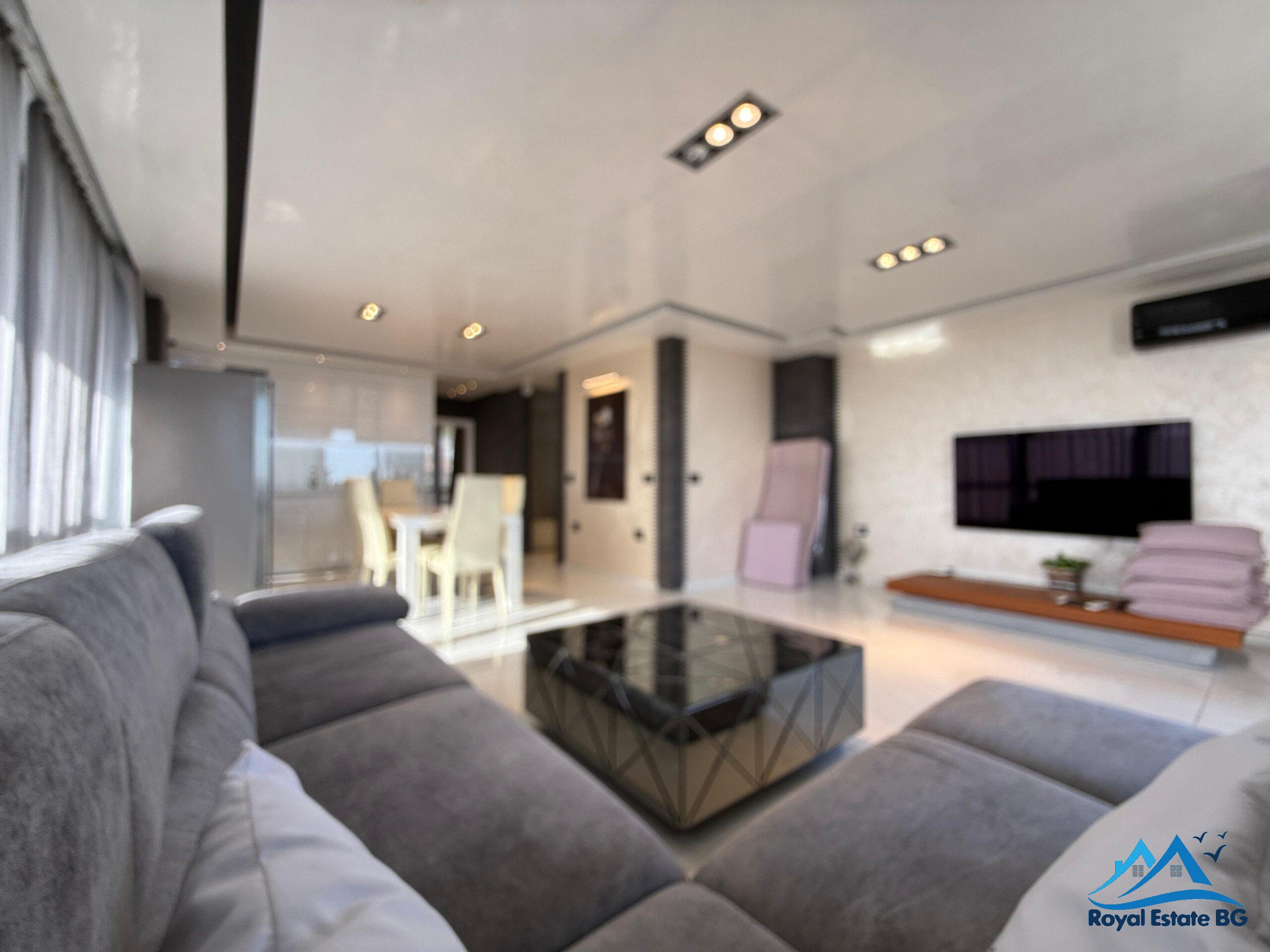 просторен хол с кухненски кът и трапезария, две спални, две бани с две тоалетни, и огромна тераса