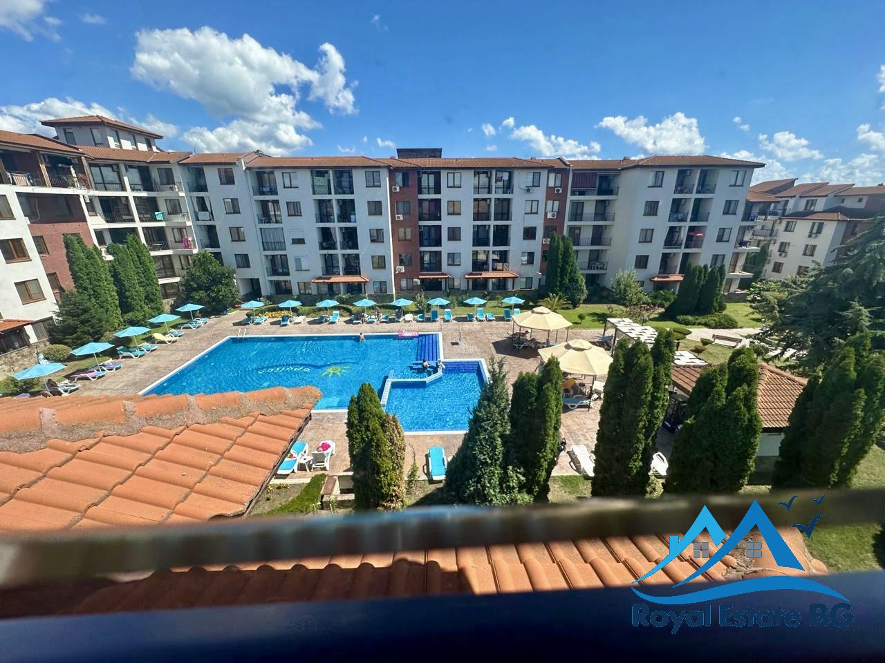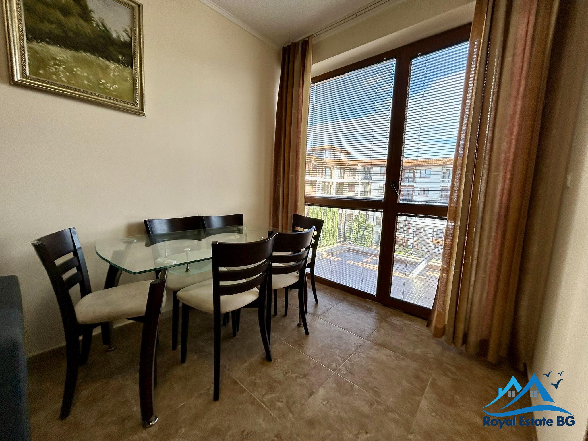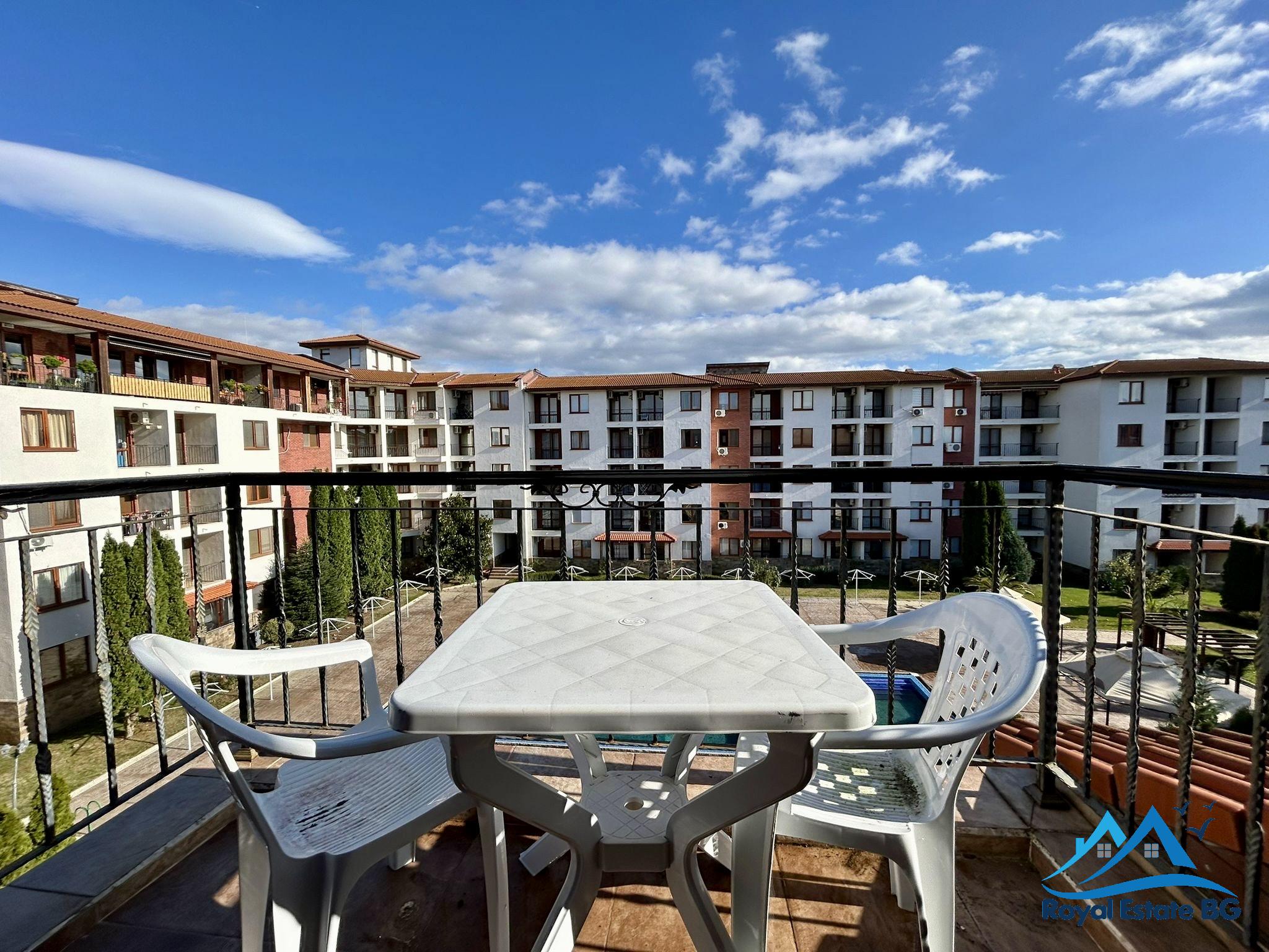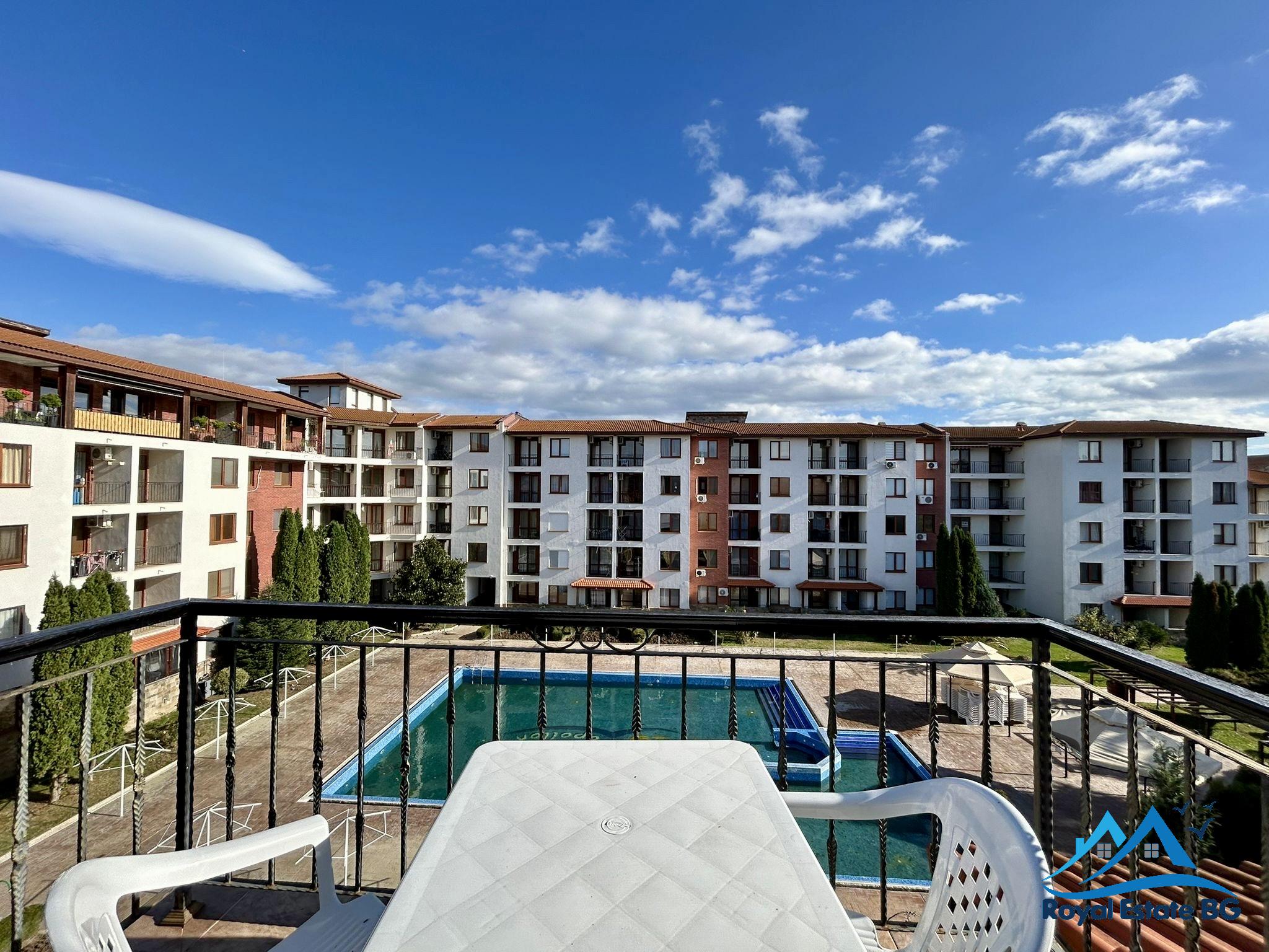 Na sprzedaż przestronne, w pełni umeblowane mieszkanie 3-pokojowe z widokiem na basen, położone w prestiżowym, zamkniętym kompleksie Apollon, zaledwie 200 metrów od plaży. Nieruchomość znajduje się na 3. piętrze i ma powierzchnię 70 m².