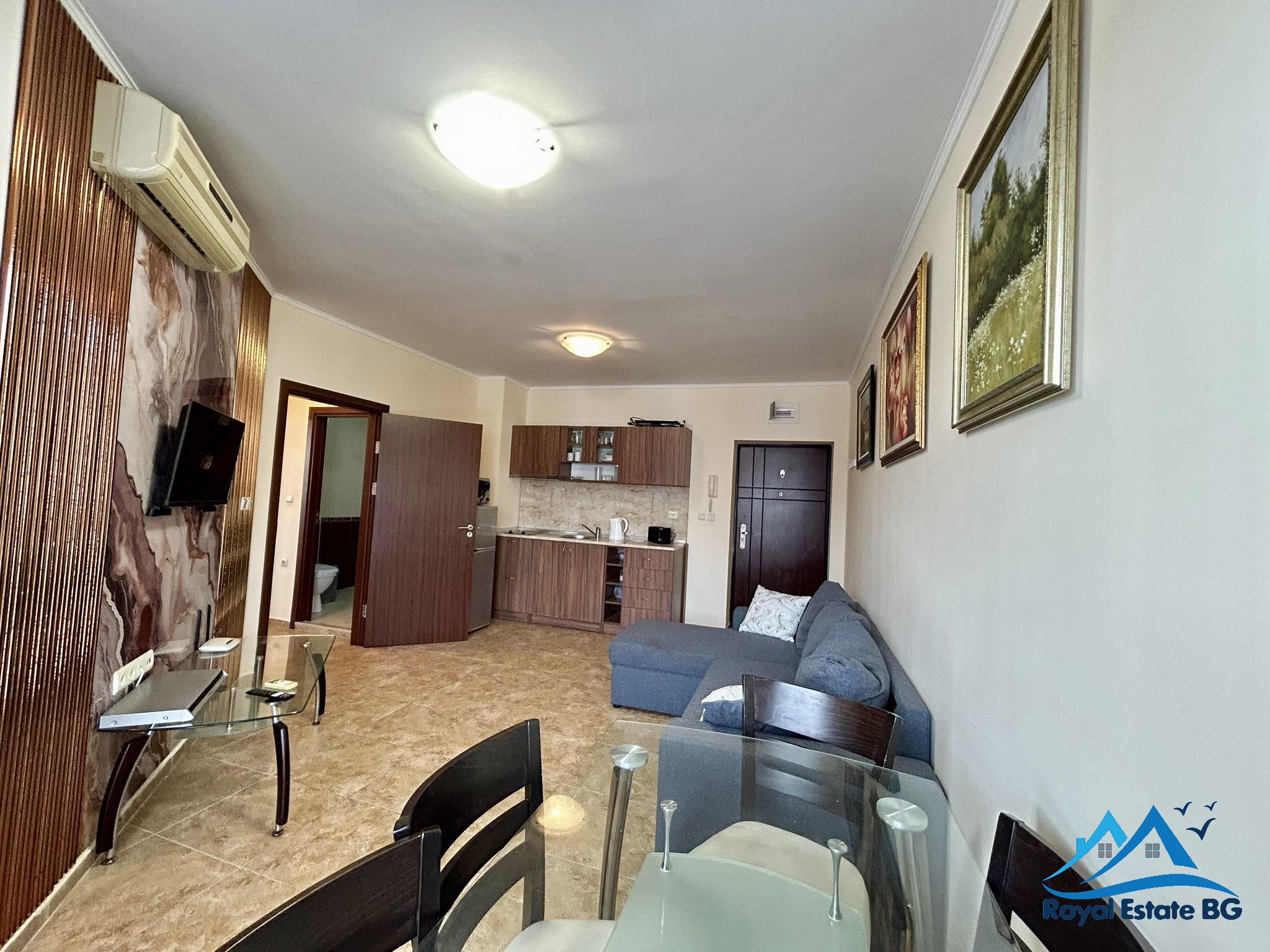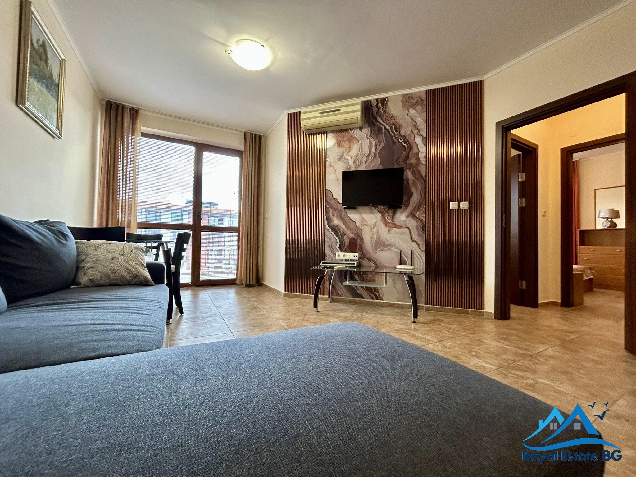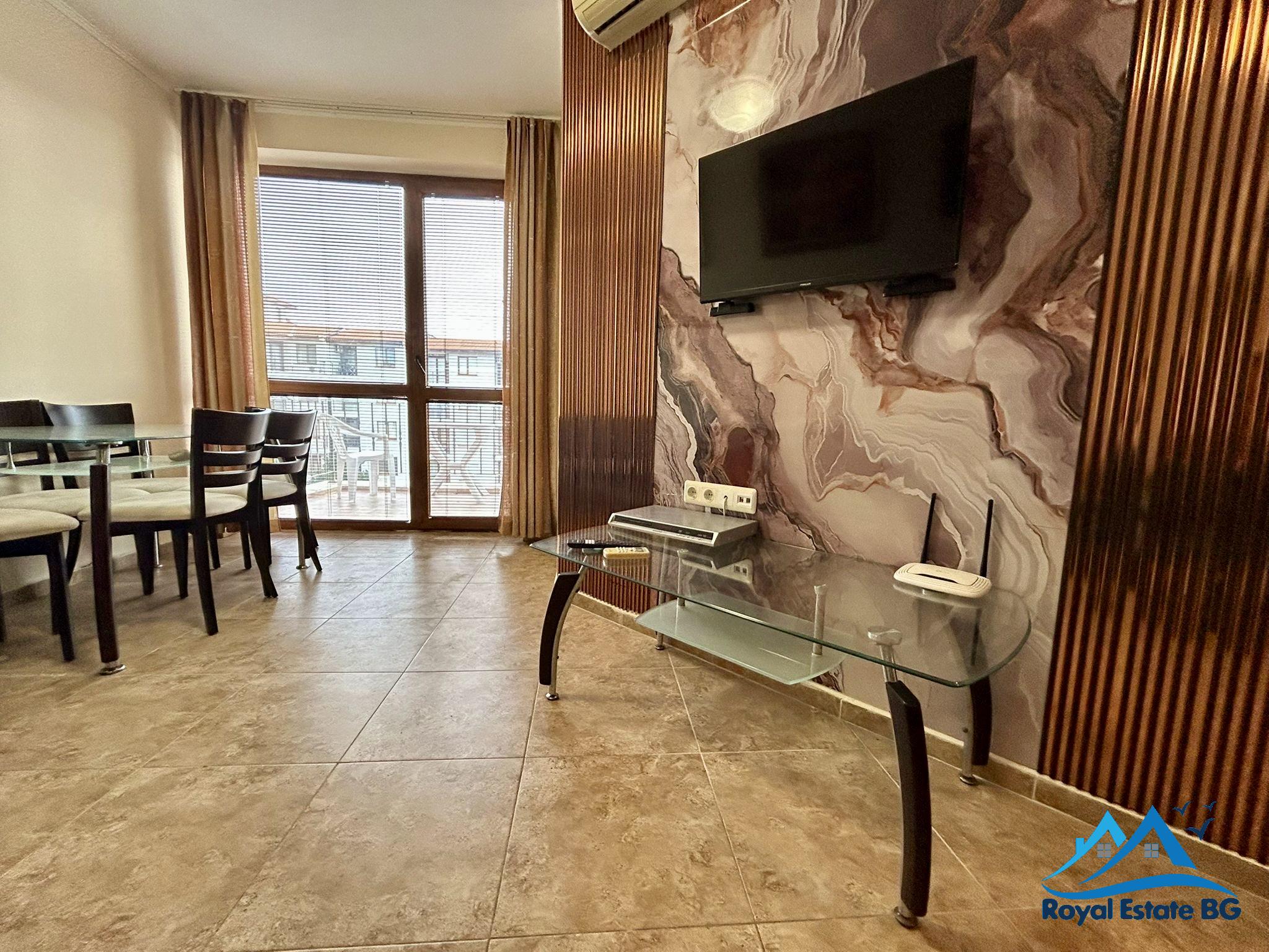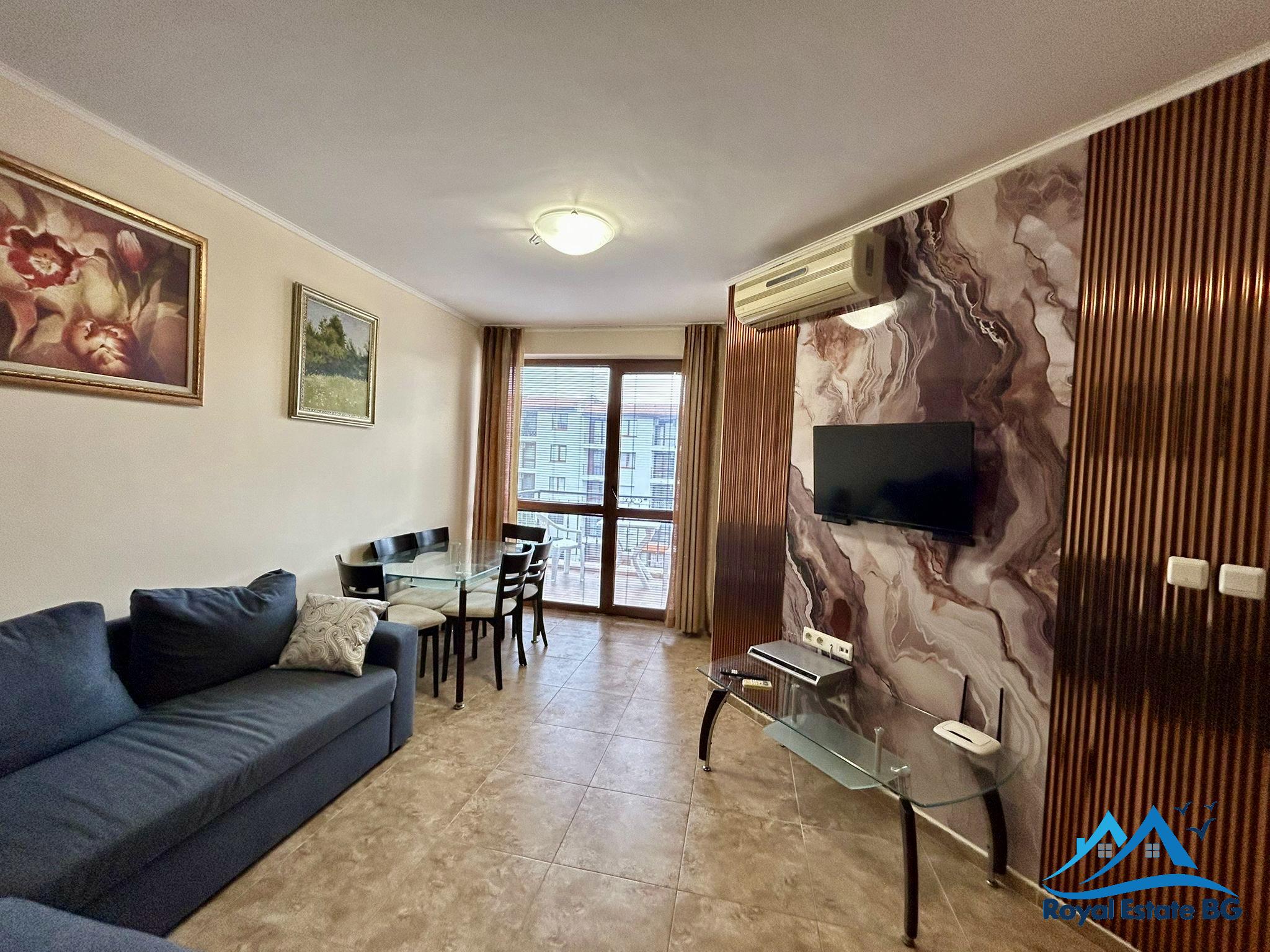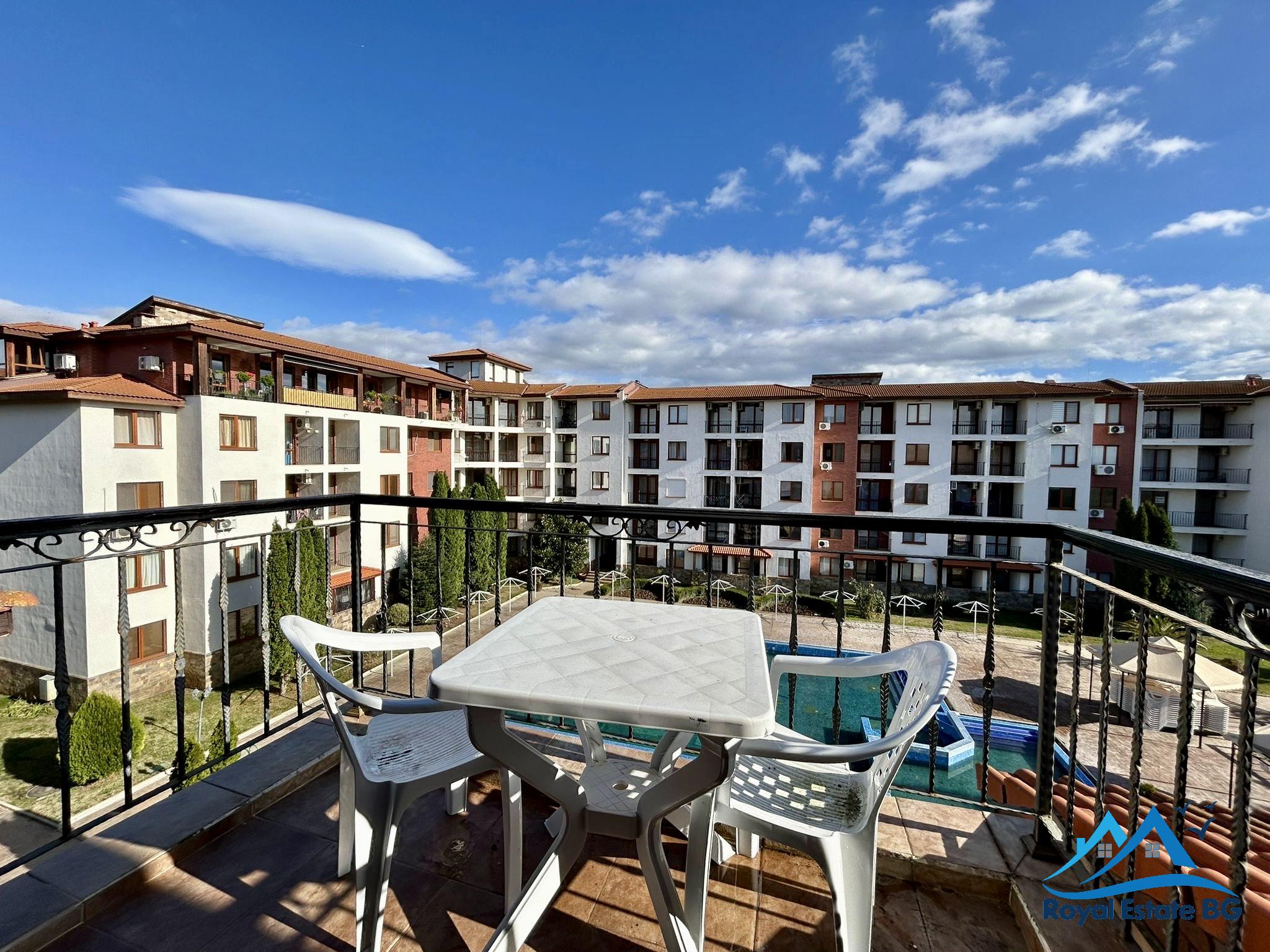Na sprzedaż przestronne, w pełni umeblowane mieszkanie 3-pokojowe z widokiem na basen, położone w prestiżowym, zamkniętym kompleksie Apollon, zaledwie 200 metrów od plaży. Nieruchomość znajduje się na 3. piętrze i ma powierzchnię 70 m².