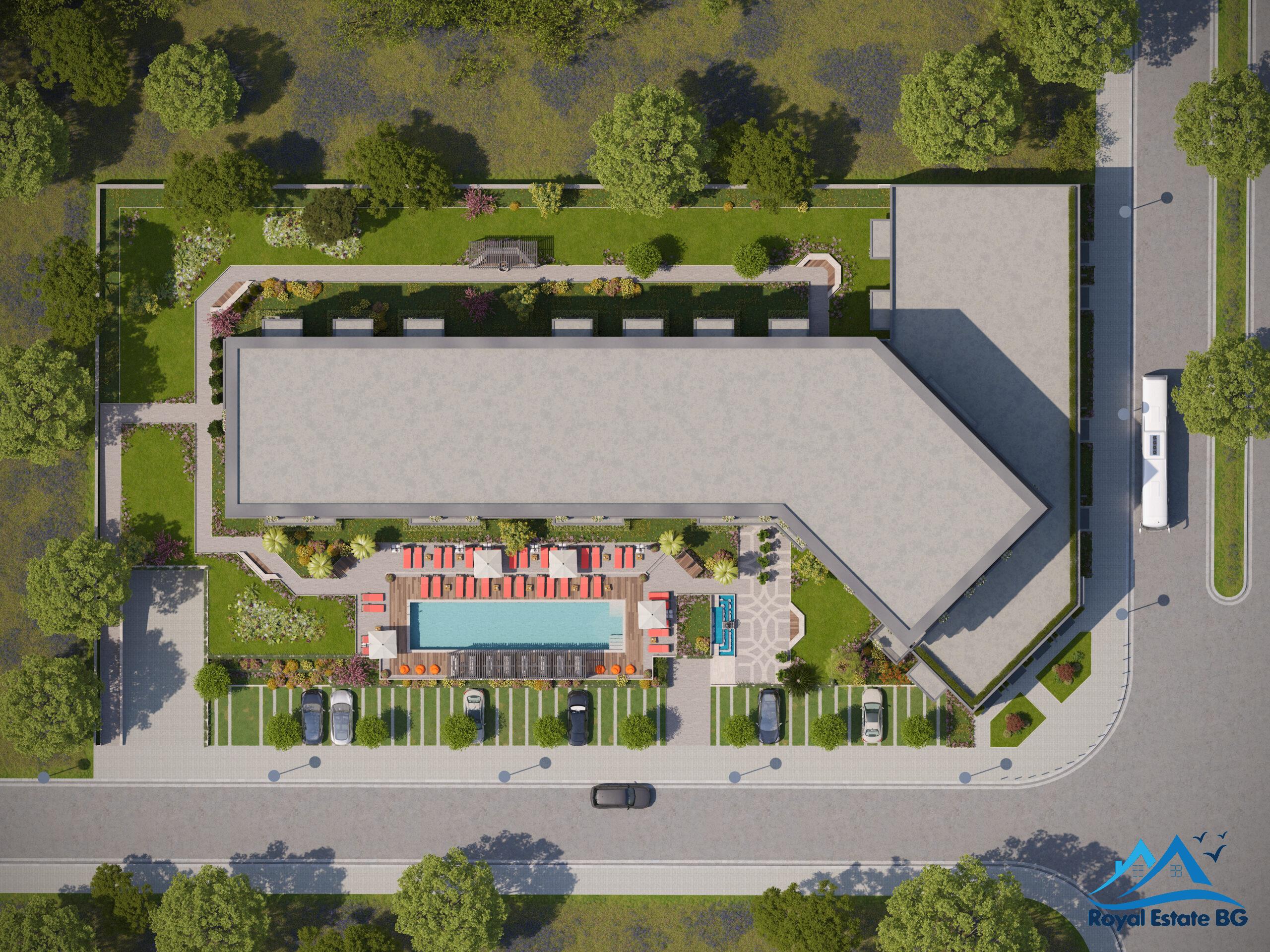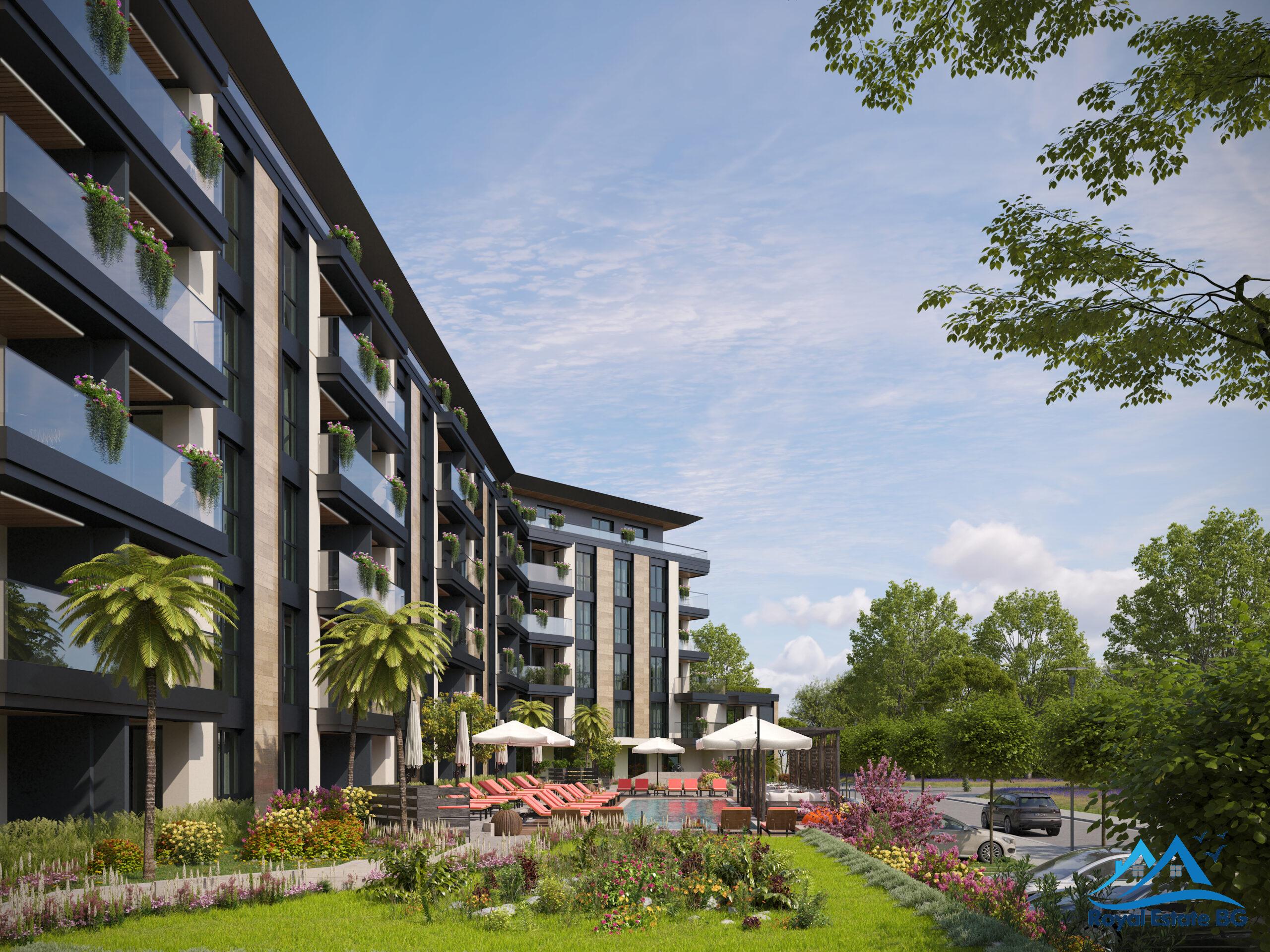 Всяко жилище разполага с тераса с гледка към басейна или градината 🌿, а на партерния етаж ще има рецепция, офис и 4 търговски обекта с лице към главната улица Несебър – Слънчев бряг.